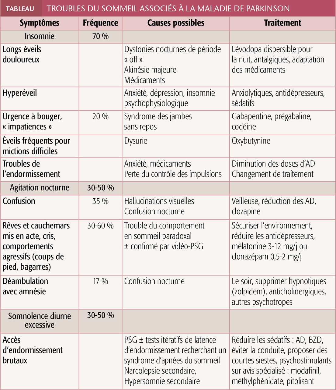 Quasiment tous les troubles du sommeil de la classification internationale (ICSD-3)2 se manifestent chez ces patients, presque toujours touchés (95 %), et sont à l’origine d’un handicap fonctionnel important.3 Les symptômes nocturnes et diurnes diffèrent par leurs mécanismes, donc par leurs traitements (tableau).