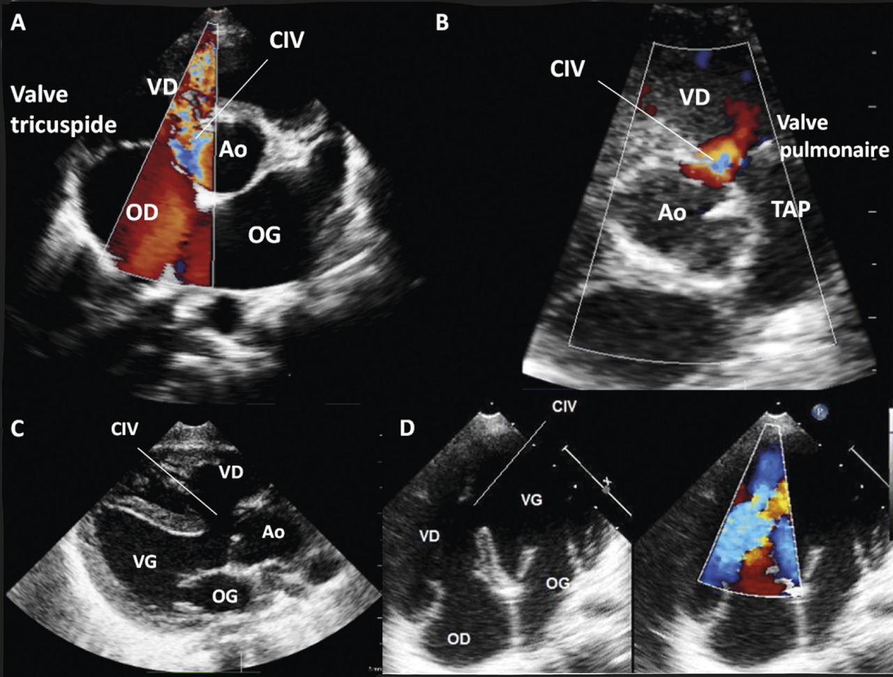 Le diagnostic est confirmé à l’échocardiographie, qui précise sa localisation et aussi quantifie le shunt, évalue les pressions pulmonaires et le retentissement.2