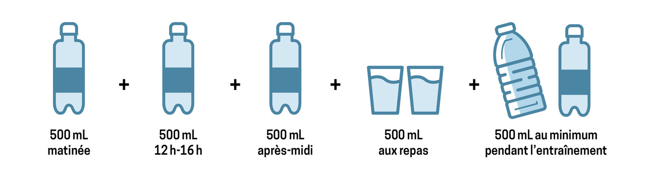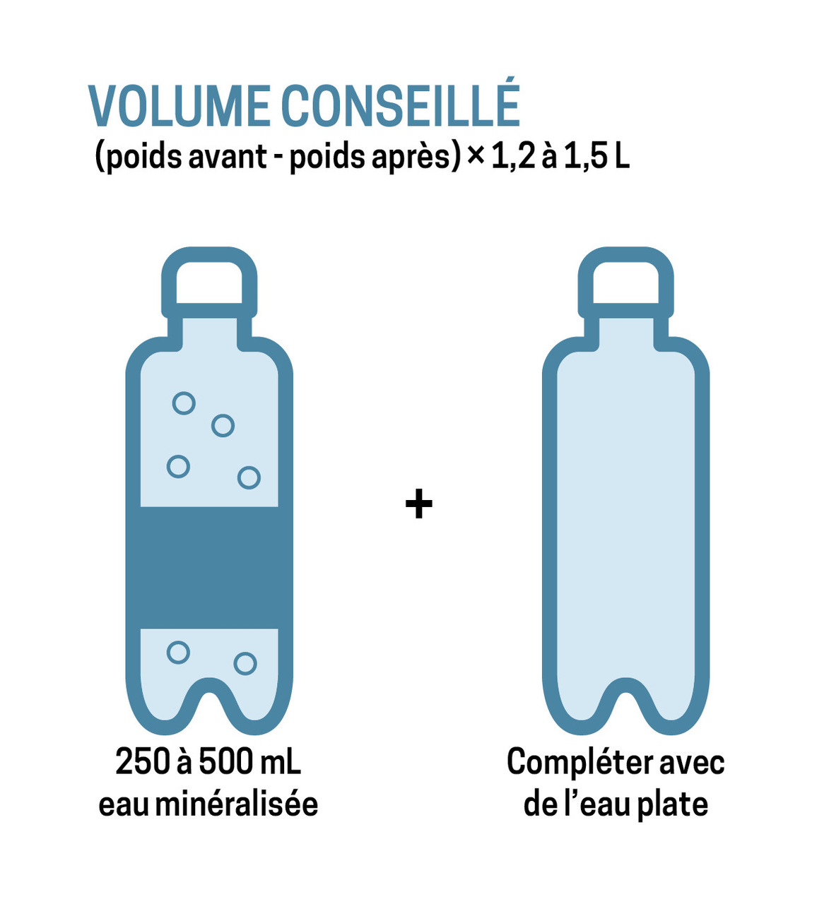 Pour couvrir les besoins hydriques de l’organisme, l’hydratation doit être d’au moins 1,5 L d’eau/j les jours de repos. Cet apport hydrique peut être composé d’eaux gazeuses, riches en bicarbonates et sels minéraux, qui permettent de corriger l’équilibre électrolytique et de désacidifier l’organisme à la suite de l’entraînement.