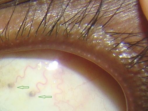 Honoré, Malien âgé de 53 ans, consulte car sa belle-mère a remarqué des tâches pigmentées au niveau de la partie supérieure de la sclère de son œil droit, qui semblent situées à l’extrémité de terminaisons de vaisseaux sinueux.