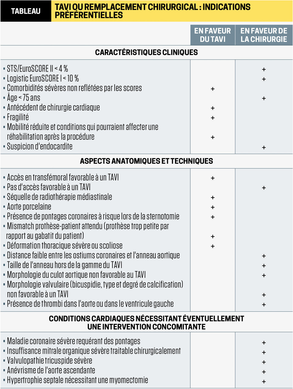 La décision est prise au cas par cas par l’équipe multi- disciplinaire au sein du centre expert (Heart Team) qui prend en compte les comorbidités, le risque chirurgical, la balance bénéfices/risques.