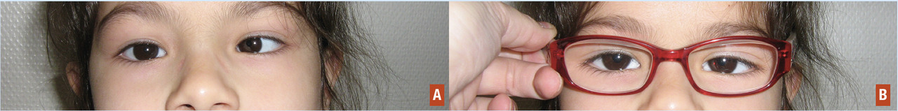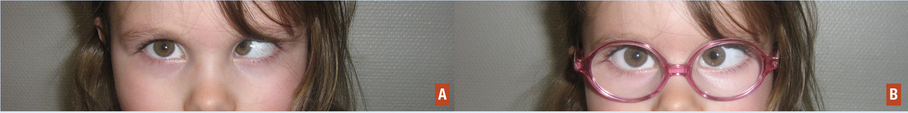 - réfractif : il s’agit le plus souvent d’enfants hypermétropes non corrigés. Les facteurs de risque sont principalement héréditaires. Les signes fonctionnels sont principalement une asthénopie accommodative et une diplopie intermittente à la fatigue. Cliniquement, sur le plan sensoriel, une amblyopie et une absence de vision binoculaire sont présentes si la prise en charge est tardive. Sur le plan moteur, la déviation est intermittente au début, importante, stable, le plus souvent sans verticalité. La correction optique totale va permettre de différencier plusieurs types :
