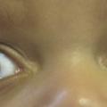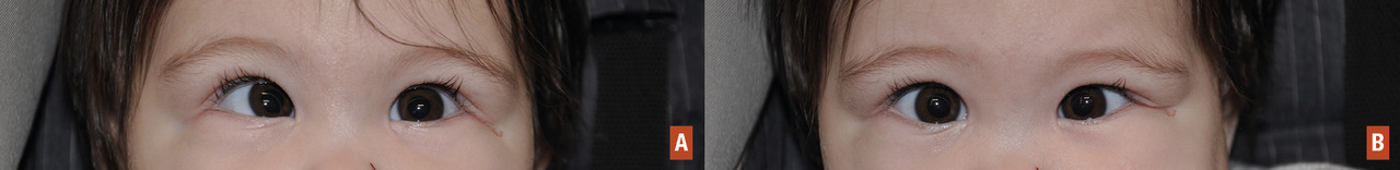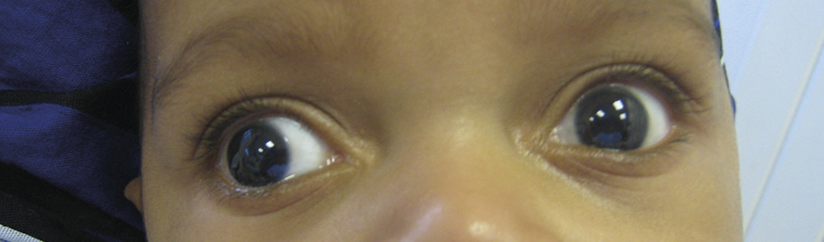 fig. 1) , exotropie possible (10 %)(fig. 2) nécessitant un bilan neuropédiatrique et neuroradiologique ; microstrabisme retrouvé dans 10 % des cas ;