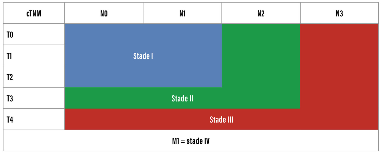 Tout d’abord, il convient de préciser, par le bilan d’extension initial, le stade de la maladie grâce à la 8e édition de la classification TNM de 2017 validée par l’Union internationale contre le cancer (UICC).1 Ce système, créé par Pierre Denoix, chirurgien oncologue français, permet de décrire la maladie cancéreuse à l’aide de trois paramètres : T pour tumor, décrivant l’atteinte locale, N pour node, décrivant l’atteinte métastatique ganglionnaire régionale, et enfin M pour metastasis, en cas d’atteinte métastatique à distance. La huitième et dernière version de la classification TNM intègre le statut p16+ pour les tumeurs oropharyngées induites par les papillomavirus (