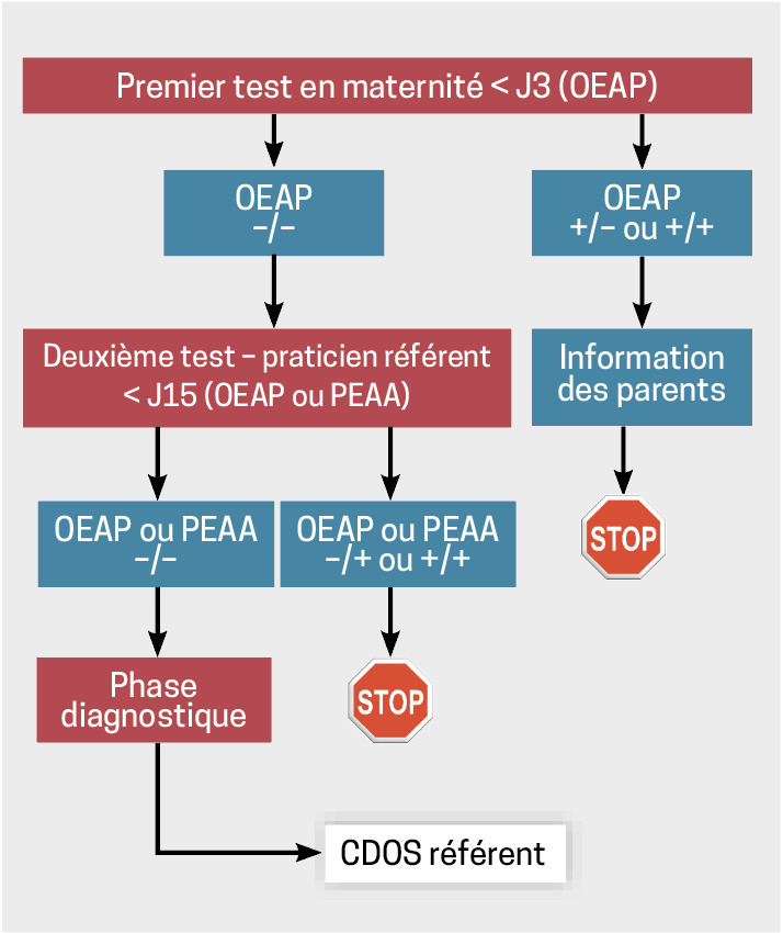 Troisième étape. Dans le CDOS référent, les bilans électrophysiologiques et étiologiques sont réalisés pour confirmer le diagnostic et, en cas de surdité, préciser le type d’atteinte auditive (transmission, perception, mixte) et le degré (de léger à profond). Prise en charge et suivi sont organisés. à noter que certaines atteintes syndromiques nécessitent une surveillance spécifique.6, 8