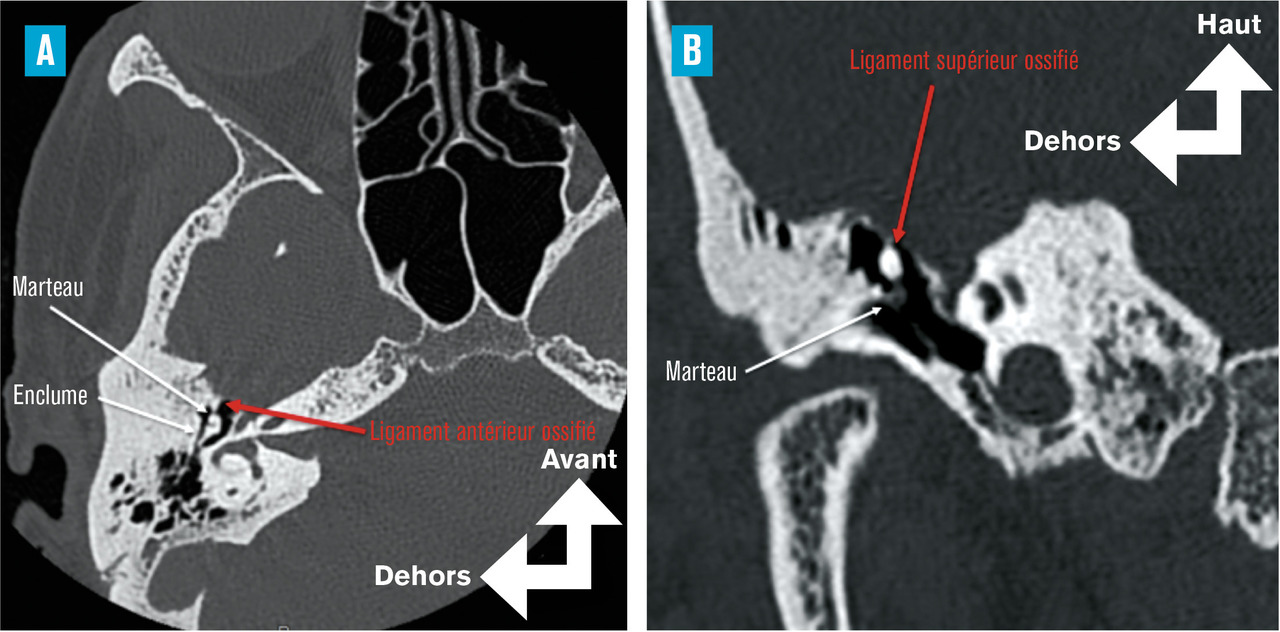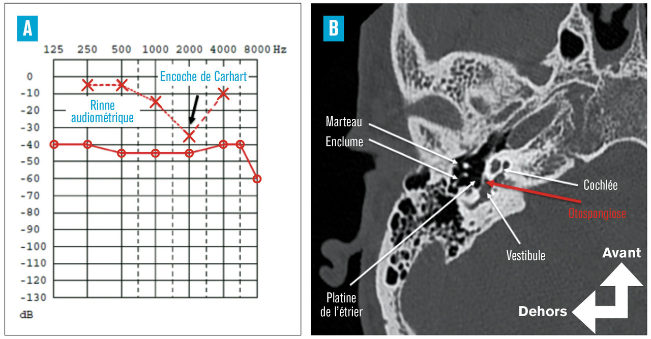 L’otospongiose est une ostéodystrophie de la capsule otique et des osselets responsable d’une ankylose progressive de la platine de l’étrier dans la fenêtre vestibulaire. Elle semble due à des facteurs génétiques, avec une transmission autosomique dominante à pénétrance variable, et touche plus souvent les femmes chez qui cette maladie semble rythmée par les épisodes de la vie génitale. Elle se manifeste par une surdité de transmission progressive, unilatérale dans 25 % des cas et bilatérale dans 75 % des cas, accompagnée d’autophonie et de paracousie de Willis (amélioration paradoxale de l’audition dans le bruit), et parfois de troubles de l’équilibre.3 L’évolution spontanée se fait vers l’aggravation de la surdité de transmission puis par l’apparition d’une surdité mixte (labyrinthisation). Le signe acoumétrique pathognomonique est le signe de Bonnier où le patient perçoit au niveau de l’oreille malade le son du diapason posé sur sa rotule. L’encoche de Carhart (encoche centrée sur 2 000 Hz) est souvent retrouvée en audiométrie. Le diagnostic de certitude repose sur l’exploration chirurgicale, mais la tomodensitométrie est devenue très performante, permettant une analyse précise de la fenêtre vestibulaire et de la platine de l’étrier : elle montre une hypodensité de la capsule otique dans la région de la fissula ante fenestram, en avant de la platine de l’étrier (Syndrome de House