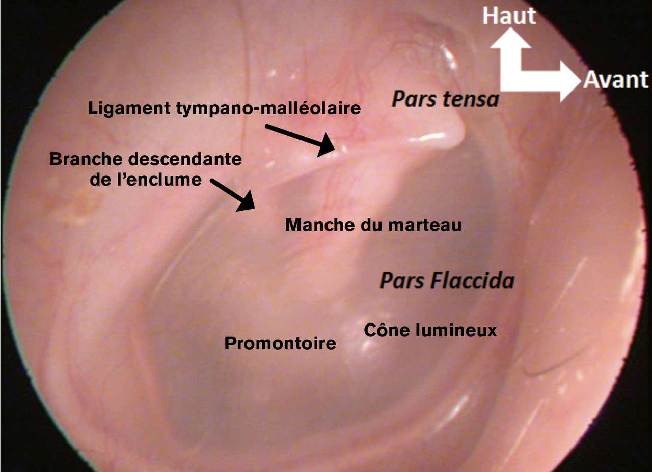 – la pars flaccida est située au-dessus des ligaments tympano-malléolaires, elle est beaucoup plus petite, dépourvue de couche fibreuse et ne joue aucun rôle dans la physiologie de l’audition.