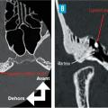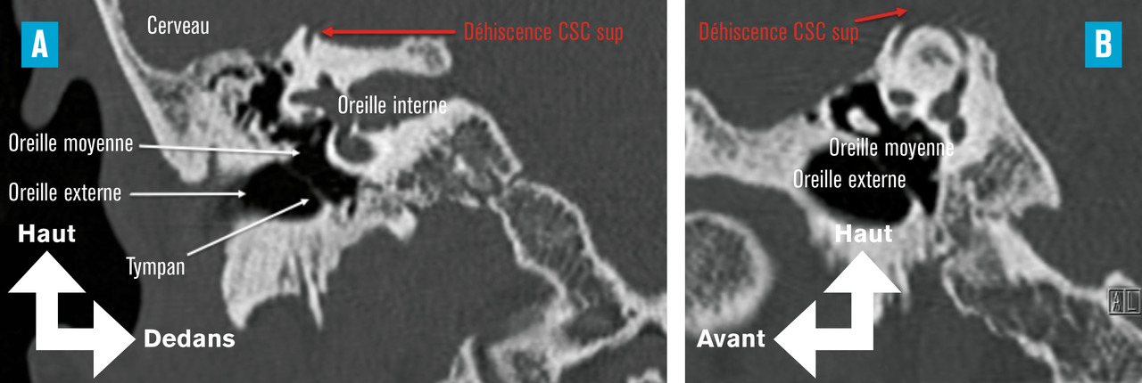 fig. 8 ). Il s’agit d’un défaut de couverture du canal semi-circulaire supérieur par l’os temporal, à l’origine d’un phénomène de « troisième fenêtre » (qui viendrait s’ajouter à la fenêtre vestibulaire et à la fenêtre cochléaire de l’oreille moyenne). La fenêtre ainsi créée entraînerait une dissipation de l’énergie acoustique des ondes sonores, expliquant ainsi la surdité. Entité clinique rare et encore débattue, elle est à évoquer devant une surdité de transmission à tympan normal chez un patient rapportant des acouphènes pulsatiles et/ou des troubles de l’équilibre provoqués lors de la manœuvre de Valsalva et au bruit fort. Il s’agit de « l’effet Tullio ».5