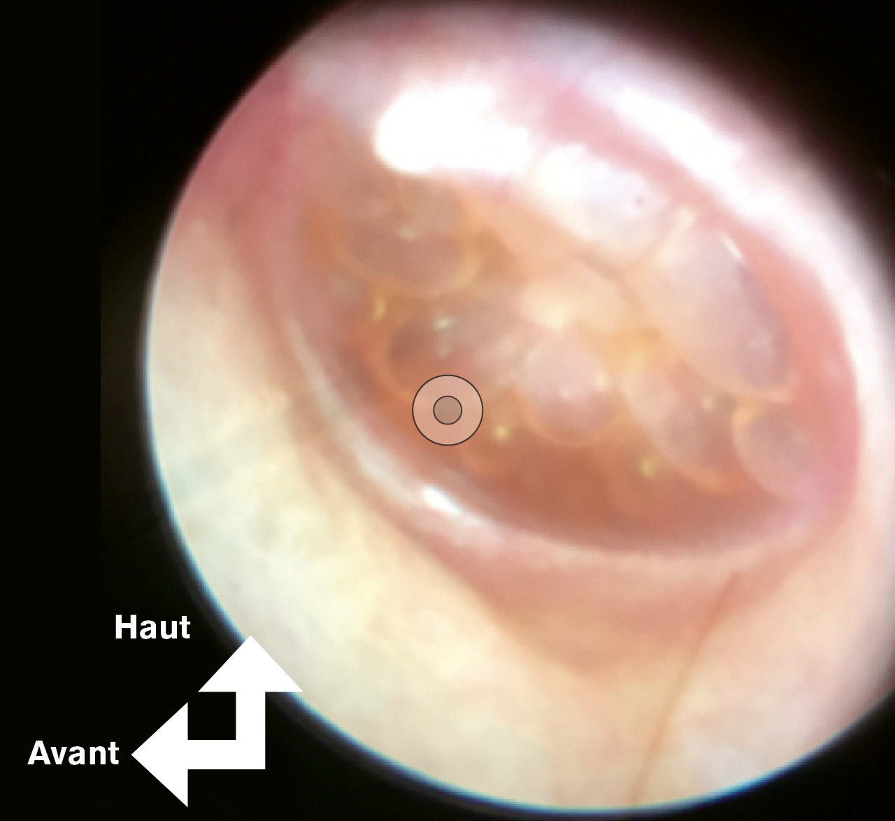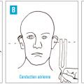 L’acoumétrie, réalisée au diapason 512 Hz, met en évidence une formule transmissionnelle, avec un signe de Weber latéralisé du côté atteint, ou du plus atteint, et un Rinne négatif, c’est-à-dire une conduction osseuse anormalement meilleure que la conduction aérienne (fig. 2 ). Le reste de l’examen ORL, vestibulaire et neurologique est normal. Ainsi, au terme de l’examen clinique, il est possible d’orienter le diagnostic et d’adresser le patient à un confrère spécialisé en ORL.