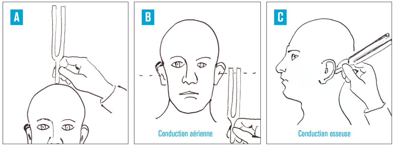 L’acoumétrie, réalisée au diapason 512 Hz, met en évidence une formule transmissionnelle, avec un signe de Weber latéralisé du côté atteint, ou du plus atteint, et un Rinne négatif, c’est-à-dire une conduction osseuse anormalement meilleure que la conduction aérienne (