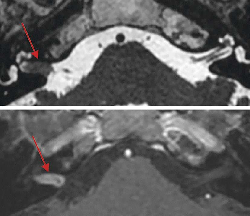 Une IRM recherche une éventuelle labyrinthite (faisant suite à une otite compliquée, elle se traduit par une prise de contraste pathologique du labyrinthe, après injection de gadolinium).