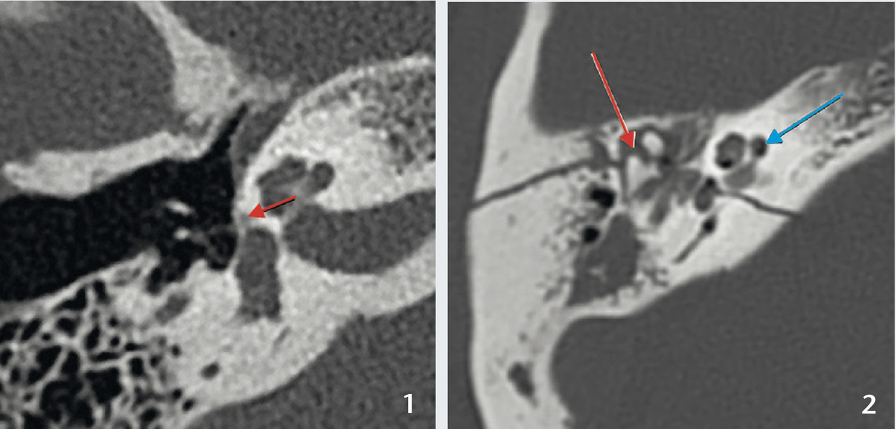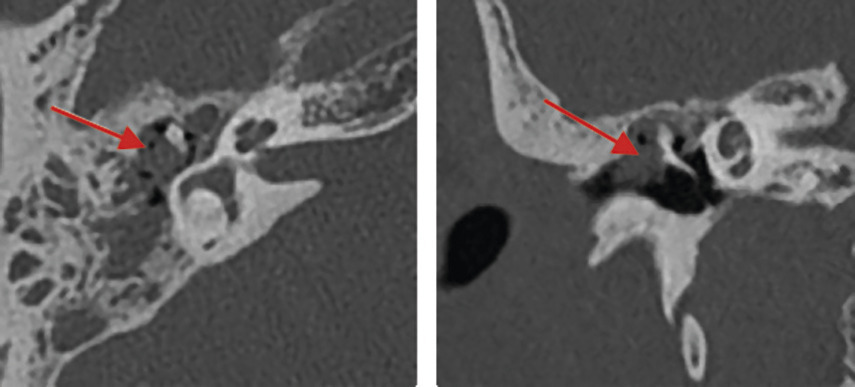 – faire le diagnostic positif en montrant le foyer otospongieux : hypodensité préstapédienne infra- ou supramillimétrique qui peut s’étendre autour du labyrinthe antérieur ou postérieur ;