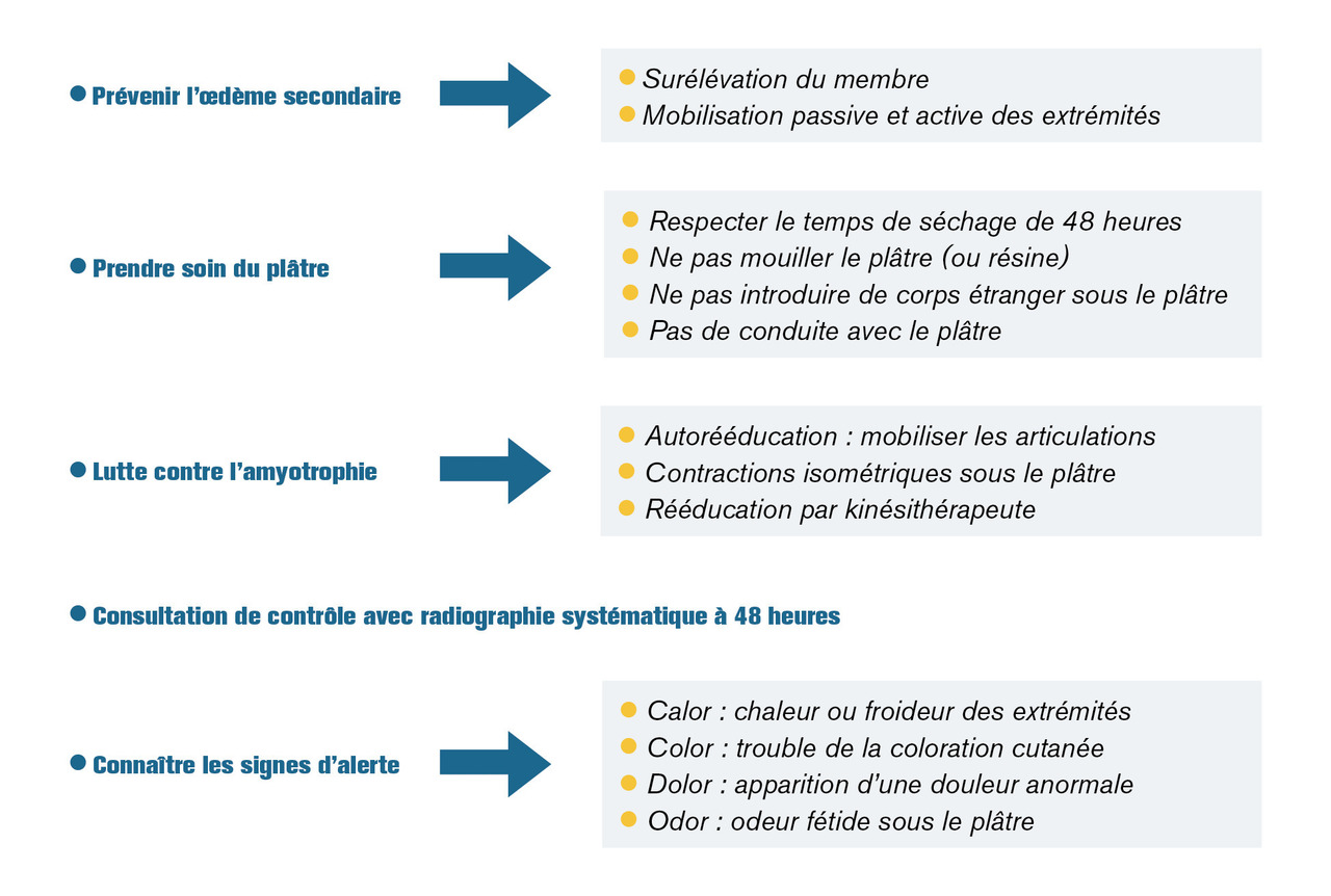 - éducation du patient, à donner par écrit (surélévation du membre, entretien du plâtre) ;