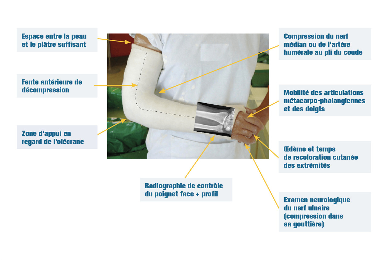 - informations du patient et de son entourage sur les situations d’urgence (augmentation ou apparition de douleurs sous le plâtre).