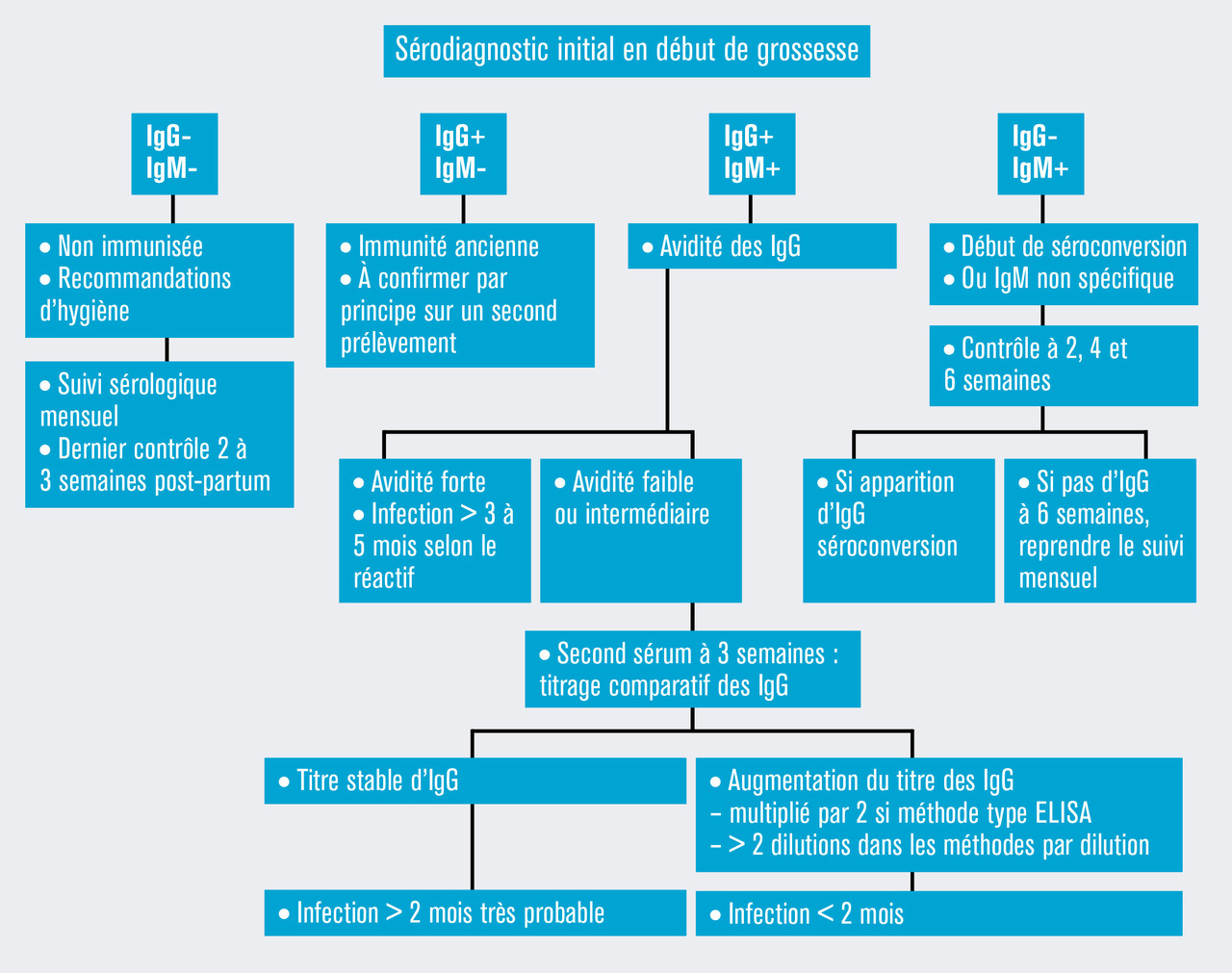 Enfin, un profil d’immunité ancienne chez une femme dont la grossesse est trop avancée (au-delà de 6 mois) ne permet pas d’éliminer formellement une contamination périconceptionnelle ou du premier trimestre.
