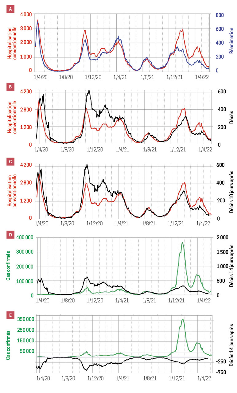 Par rapport au déroulement de l’infection, les différents indicateurs donnent des informations plus ou moins décalées dans le temps. Il en est ainsi des nombres de décès, d’admissions en réanimation et en hospitalisation conventionnelle, et de cas confirmés en France (figures disponibles sur https://bit.ly/3m2LOXD).