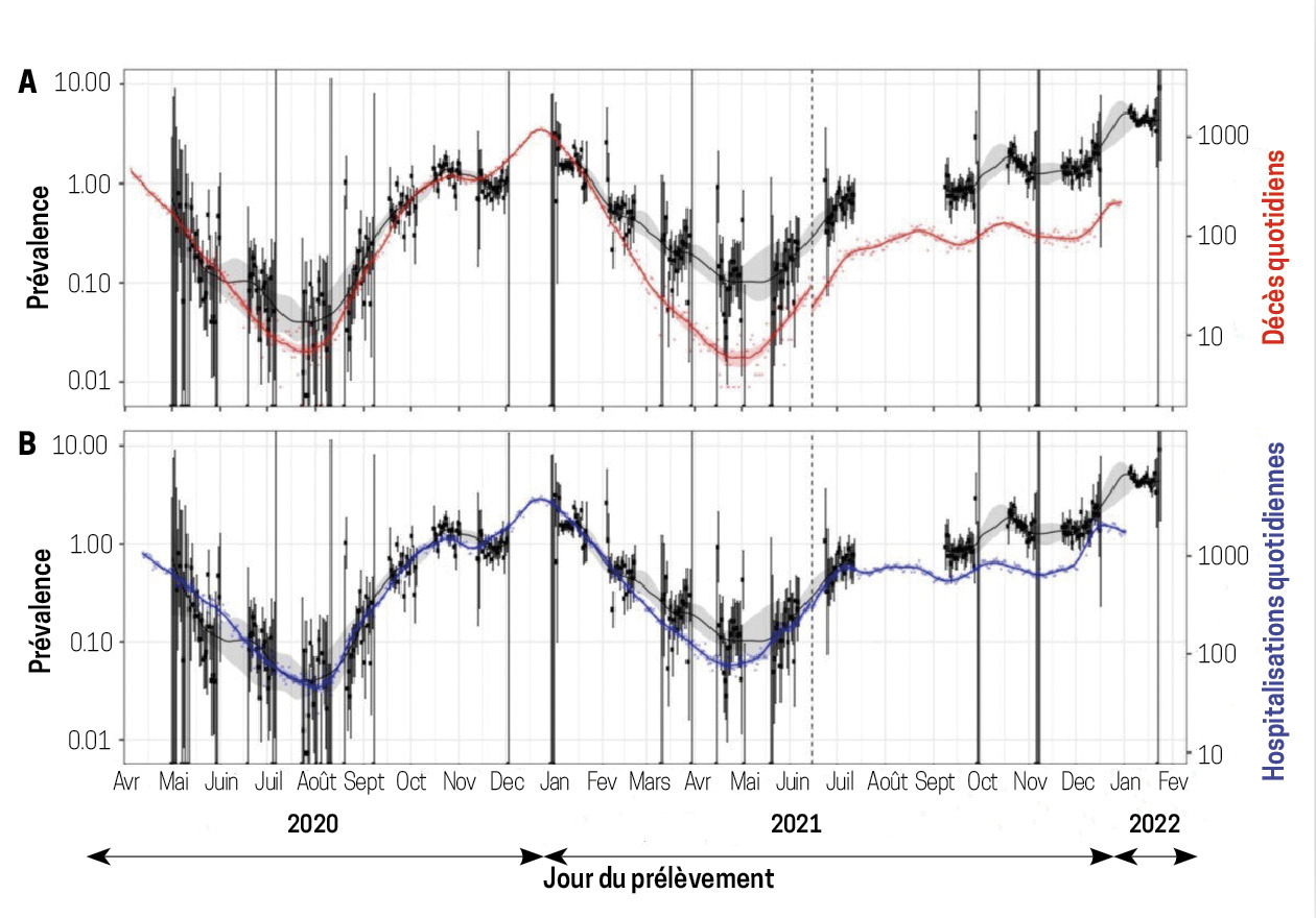 C’est le nombre de cas présents à un instant donné dans une région géographique déterminée, quelle que soit l’ancienneté de l’infection. Si on ne peut pas déterminer le nombre de cas dans l’ensemble de la population, réaliser une recherche systématique dans un échantillon représentatif de la population est une méthode très efficace et beaucoup moins chère. Les organismes de sondages savent en effet définir un échantillon représentatif, contenant la même proportion de personnes que dans l’ensemble de la population en termes de sexe, d’âge, de niveau de vie, de type de résidence urbaine ou rurale, etc. Ainsi, pour connaître la prévalence des infections Covid, des chercheurs anglais, associés à un organisme de sondages, ont envoyé à des échantillons représentatifs de la population un kit pour effectuer un autoprélèvement nasal, ce dernier étant ensuite envoyé à un laboratoire pour faire un test PCR. Des échantillons successifs de 150 000 personnes ont ainsi été testés de mai 2020 à mars 2022. (La figure représentant les résultats des 19 sondages est disponible sur https://bit.ly/3m2LOXD).4 La prévalence moyenne de l’infection dans le sondage de mars 2022 était d’environ 6 % en moyenne.