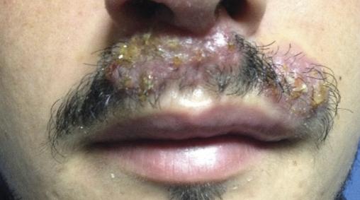Stéphane, 28 ans, sans antécédents, consulte pour des lésions du visage évoluant depuis plusieurs semaines. Les traitements par valaciclovir et pristinamycine ont été inefficaces. L’examen objective un placard inflammatoire de la moustache avec des pustules et des croûtes jaunâtres. Le patient indique qu’il travaille dans une ferme d’élevage, avec de nombreux animaux. Le prélèvement fongique révèle un Microsporum.