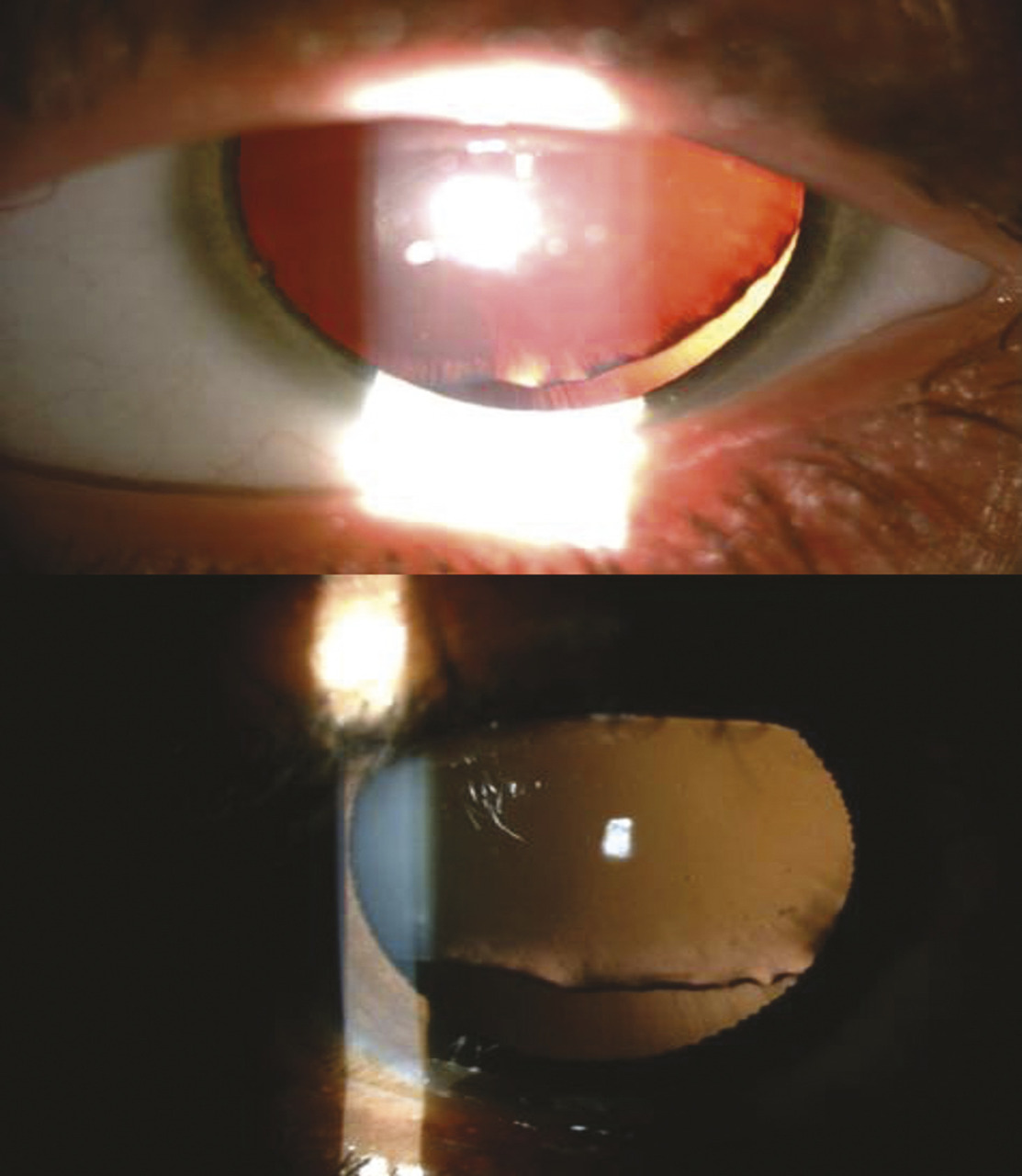 L’ectopie du cristallin est un signe diagnostique majeur (comme l’anévrisme aortique), elle est souvent supérieure et temporale, et souvent incomplète (fig. 4 ). Lorsqu’elle est importante, elle peut conduire à la cécité. Son diagnostic justifie une dilatation pupillaire soigneuse et un examen à la lampe à fente. Les autres signes ophtalmologiques sont les cornées plates et la myopie secondaire à une longueur axiale augmentée (la chirurgie de la myopie n’est souvent pas indiquée).