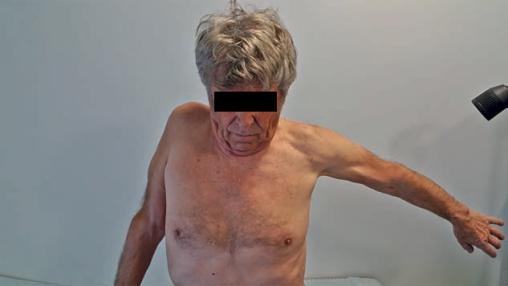 À l’examen : abduction du membre supérieur droit impossible (fig. 1) ; parésie à 3/5 de l’antépulsion, pas d’anomalie des réflexes ostéo-tendineux. Amyotrophie du moignon de l’épaule droite (fig. 2).