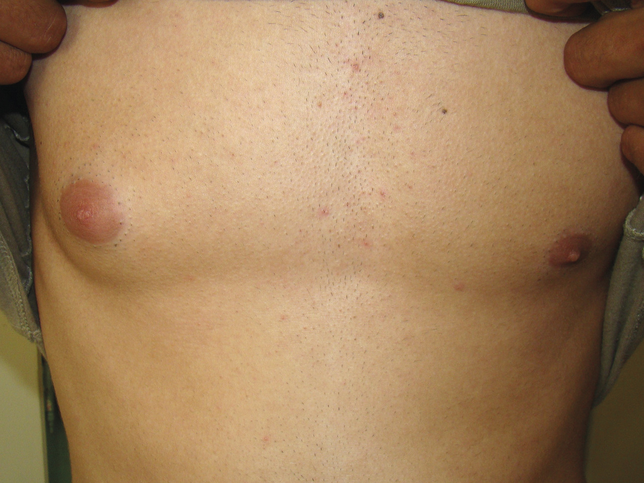 Cédric, 19 ans, consulte pour une asymétrie au niveau de la poitrine. En effet, l’examen montre un développement plus important de son sein droit par rapport au gauche.