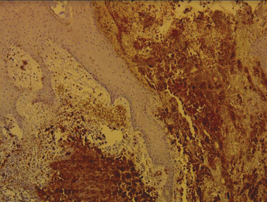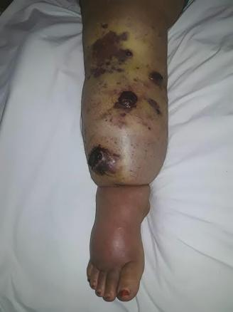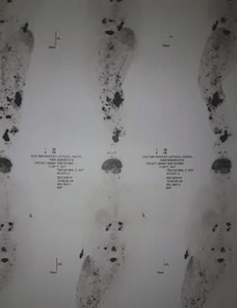 Cette femme de 34 ans consultait pour l’apparition récente (1 mois) de lésions bourgeonnantes violacées saignant au contact sur la face antérieure de la jambe droite ; ce membre étant le siège d’un lymphœdème chronique idiopathique depuis 4 ans. L’examen notait des lésions nodulaires angiomateuses, dont la plus grande avait un grand axe de 3,5 cm, ulcérées au centre, saignant au contact (fig. 1 ). La biopsie cutanée montrait un aspect morphologique et immunohistochimique en faveur d’un angiosarcome (fig. 2 ). La tomographie par émission de positons (fig. 3 ) montrait des plages hypermétaboliques multiples osseuses et tissulaires ainsi que de volumineuses adénopathies multiétagées. Le diagnostic retenu était celui d’angiosarcome métastatique. La patiente décédait une semaine plus tard.