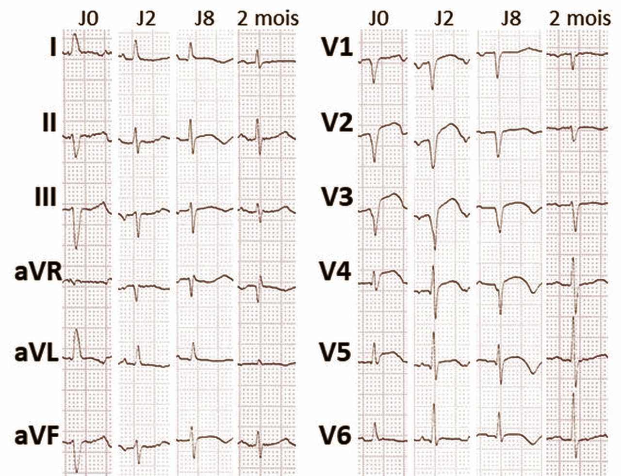 L’ECG est anormal dans la quasi-totalité des cas, avec des troubles importants de la repolarisation : sus-décalage du segment ST, ondes T négatives, rabotage de l’onde R en V1-V4 (