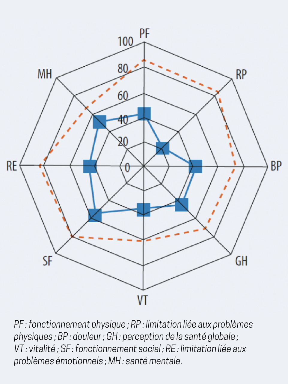 En revanche, la morbidité liée au syndrome d’hyperventilation est élevée, avec des répercussions majeures sur la qualité de vie4 et le présentéisme au travail.5 Le questionnaire de qualité de vie générique SF-36 a montré que la qualité de vie des patients souffrant d’un syndrome d’hyperventilation était profondément altérée dans tous les domaines, notamment dans ceux relatifs à la condition physique (fig. 1 ).4 Les conséquences sur les coûts de santé, probablement importantes, n’ont jamais été évaluées.
