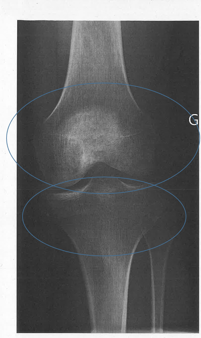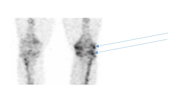 Après deux mois, et malgré la rééducation, une impotence fonctionnelle se manifeste par un flessum à 15 ° du genou gauche, associé à des douleurs. La radiographie révèle des anomalies de la trame osseuse (fig. 1), évocatrices d’un syndrome douloureux régional complexe, confirmé par la scintigraphie osseuse (fig. 2).