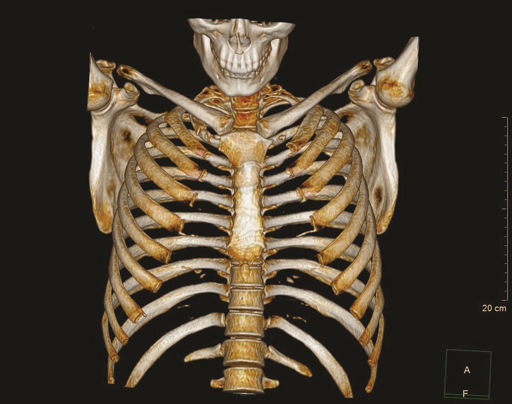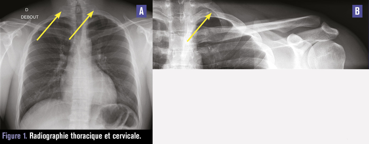 Ce jeune engagé de 21 ans consultait pour une douleur persistante du membre supérieur gauche avec hypotonie, hypoesthésie et paresthésie pour tous mouvements bras levé gauche et lors du port d’un sac à dos. L’examen clinique au repos était sans particularité. Le test d’Allen (position « haut les mains », menton levé, rotation controlatérale de la tête, inspiration profonde) et le test de Roos (position « haut les mains », mouvements lents de fermeture et ouverture de la main) étaient positifs dès 40 secondes avec reproduction de symptômes. Les tests musculaires étaient normaux. L’imagerie (radiographie cervicale [fig. 1], arthrotomodensitométrie [fig. 2], angio-imagerie par résonance magnétique [IRM] et électromyogramme [EMG]) montrait des côtes cervicales surnuméraires. Le bilan neurovasculaire était normal. Une simple éviction des situations à risque avec rééducation a résolu la doléance.