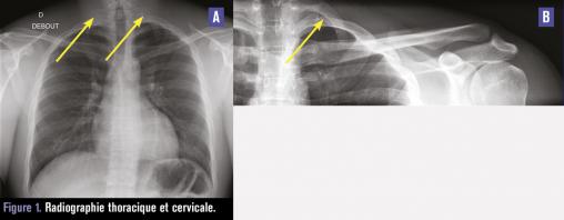 Une côte cervicale surnuméraire est présente chez 0,5 % de la population ; 10 % des patients sont symptomatiques et 9 % justifient une décompression chirurgicale.1 Lié à la compression du plexus brachial, le tableau clinique prend la forme d’un syndrome du conflit thoracique très variable (douleur, paresthésie, faiblesse du membre) lors de l’élévation prolongée du bras. Les tests cliniques sont peu spécifiques et sensibles et justifient de les associer (Adson, Allen, Roos). L’imagerie réalisée comprend radiographie cervicale, IRM et EMG notamment. Une kinésithérapie (protocole de Peet), des injections de corticoïdes, voire une chirurgie de décompression (scalénectomie, exérèse costale) peuvent être nécessaires.2