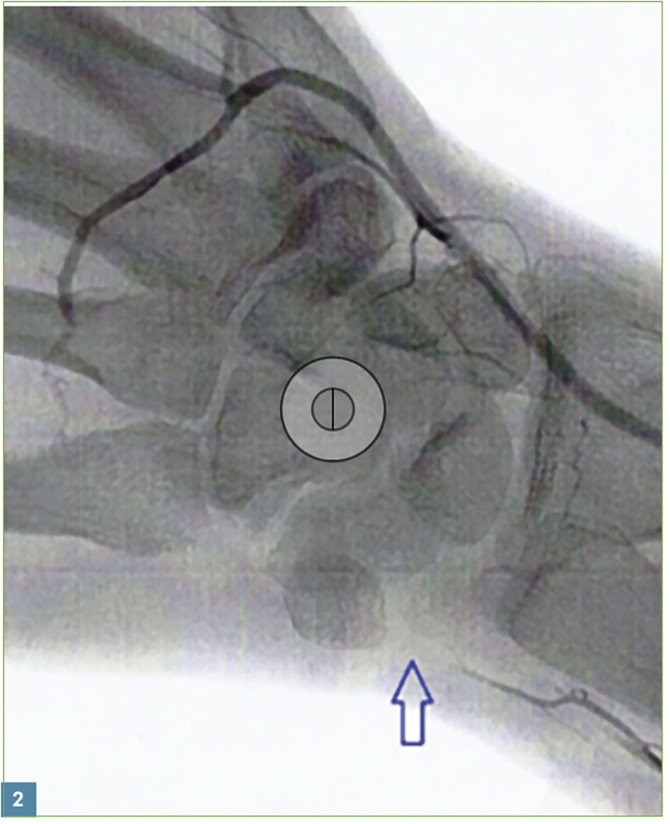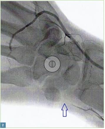 Pour confirmer le diagnostic, un doppler est réalisé. L’artériographie objective une obstruction de l’artère ulnaire (fig. 2 ; flèche).