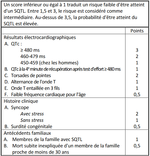 Le diagnostic repose essentiellement sur la mesure de l’intervalle QT corrigé afin de tenir compte de la fréquence cardiaque (QT corrigé ou QTc). Un système de score (tableau) a été établi, prenant en compte des paramètres ECG et cliniques personnels et familiaux. L’ECG en 12 dérivations permet de mesurer l’intervalle QT, préférentiellement en D2 ou V5, et de calculer le QTc selon la formule de Bazett : QTc (en ms) = QT (en ms)/√RR (en s), où RR représente l’intervalle entre 2 QRS. En cas d’arythmie sinusale marquée, on fait la moyenne de 3 valeurs de QTc consécutifs.
