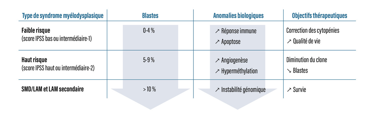 Par ailleurs, le clone anormal, bloqué dans sa maturation, peut acquérir d’autres anomalies biologiques responsables de sa prolifération. Ces cellules immatures sont appelées « blastes » et leur expansion se traduit morphologiquement par un excès de blastes, fréquemment (mais pas toujours) rencontré dans les syndromes myélodysplasiques. Le pourcentage de blastes médullaires est corrélé à la sévérité de la maladie. L’évolution naturelle se fait vers l’augmentation des blastes médullaires et peut aboutir à une leucémie aiguë myéloïde (LAM). Il existe donc un continuum entre syndromes myélodysplasiques et leucémie aiguë myéloïde illustré par la forme frontière dite leucémie aiguë myéloïde/syndrome myélodysplasique (LAM/SMD) isolée dans la classification de l’International Consensus Classification (ICC) 2022 utilisée actuellement (