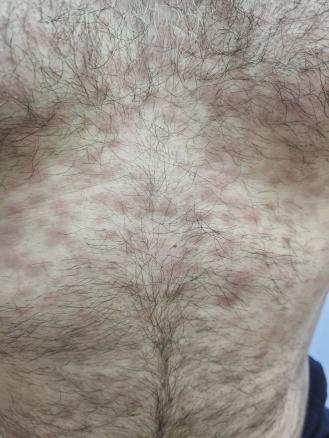 Un patient de 49 ans sous trithérapie pour une infection par le VIH consulte pour des lésions cutanées apparues depuis dix jours et s’étendant progressivement. L’examen clinique objective des macules érythémateuses non prurigineuses sur le tronc et les membres supérieurs, sans atteinte des muqueuses. Le diagnostic de roséole syphilitique est évoqué, confirmé par la sérologie.