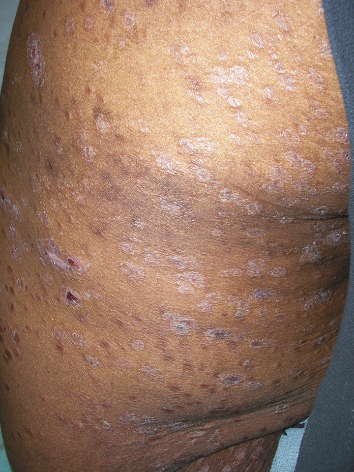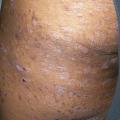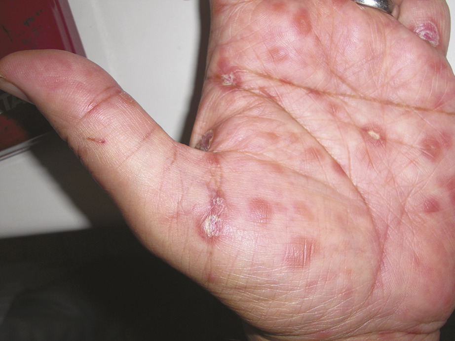 C’est la phase de bactériémie syphilitique. Elle est inconstante (un tiers des patients infectés seulement). Elle apparaît rapidement après le début du chancre et toujours dans l’année qui suit le chancre. Elle peut coexister avec le chancre d’inoculation (syphilis primo-secondaire). Ses manifestations dermatologiques sont polymorphes (c’est la « grande simulatrice »). Elle peut persister jusqu’à 6 mois.L’éruption cutanée évolue en deux phases successives : d’abord la roséole (première floraison), exanthème peu visible, fait de macules rose pâle, non prurigineuses, pouvant facilement être confondu avec un exanthème viral ou une toxidermie. Ensuite survient la seconde floraison : les syphilides papulo- squameuses plus tardives (2e-4e mois), faites de papules, rouge sombre cuivré, à base indurée localisées sur le tronc (fig. 3) et le visage. La localisation aux paumes des mains et aux plantes des pieds est caractéristique mais inconstante (fig. 4). Ces lésions cutanées sont contagieuses quand elles sont érosives. À ce stade, le tableau clinique est très polymorphe, et la syphilis secondaire peut aisément être confondue avec un psoriasis ou une dermite séborrhéique, un pityriasis rosé de Gibert, ou parfois même une acné.