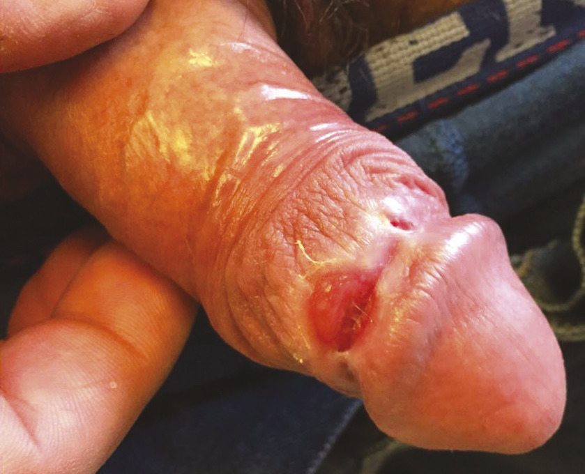 Le chancre est constant (sauf dans les syphilis congénitales et post- transfusionnelles), mais pas toujours visible, comme par exemple dans les localisations cervicale, vaginale, rectale ou pharyngée. Cliniquement, c’est une ulcération cutanée ou muqueuse, superficielle, indolore, circonscrite, propre, reposant sur une base indurée (au palper protégé) et unique dans deux tiers des cas (fig. 2). Une surinfection locale peut modifier les caractéristiques habituelles du chancre et le rendre atypique. Cependant, le clinicien doit rester systématique et toute ulcé- ration génitale reste une syphilis primaire jusqu’à preuve du contraire. Le diagnostic différentiel le plus fréquent est l’herpès génital.L’adénopathie satellite accompagne souvent le chancre génital et a une valeur diagnostique rétrospective. Elle est inguinale, uni- ou bilatérale, le plus souvent unique, froide, indolore, non inflammatoire et ne fistulisant pas à la peau, au contraire des bubons associés à d’autres IST.