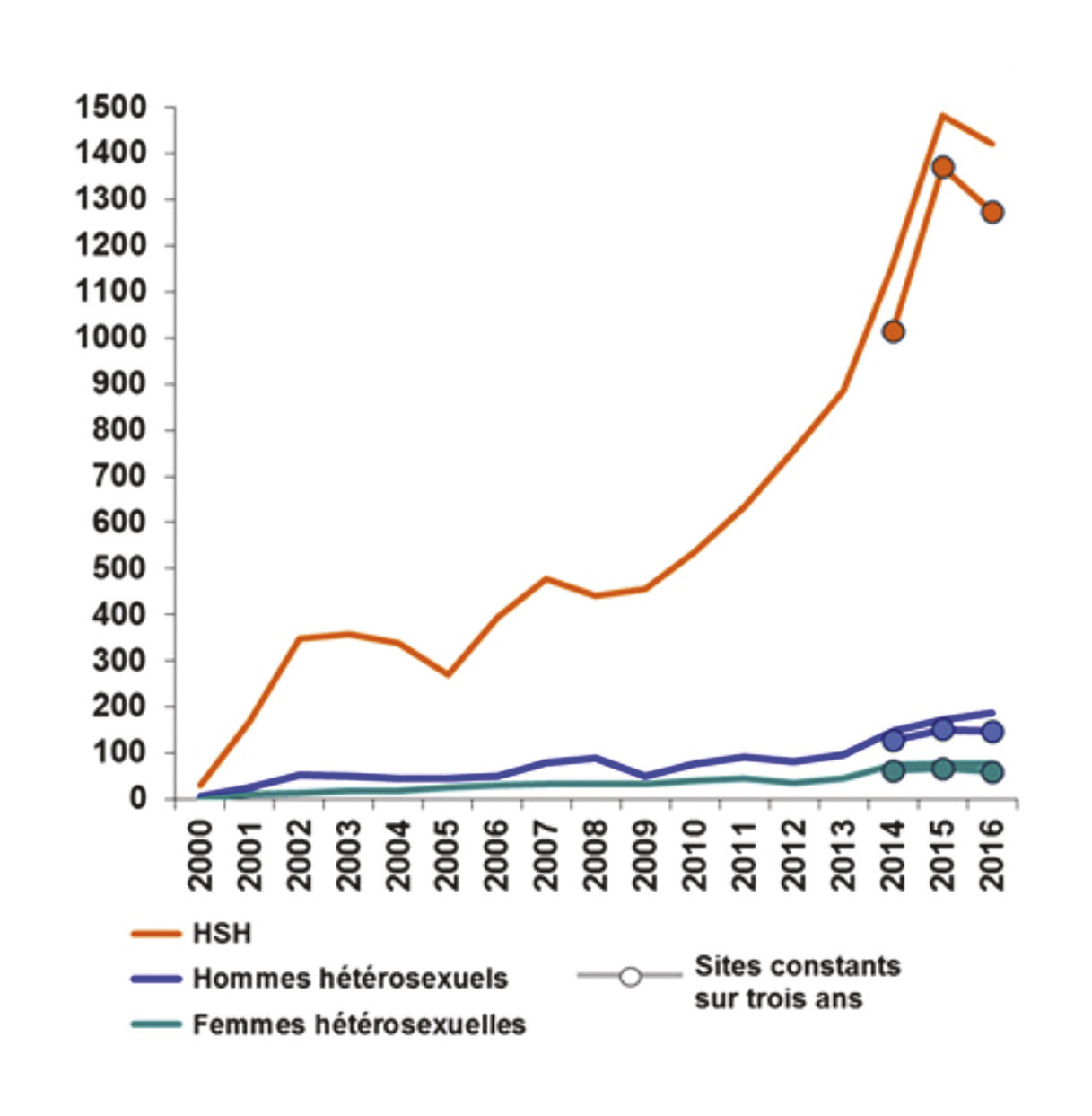 Chez les HSH, le nombre de cas de syphilis récente n’a cependant pas augmenté en 2016. Cette tendance est également observée chez les hétérosexuels (fig. 1).
