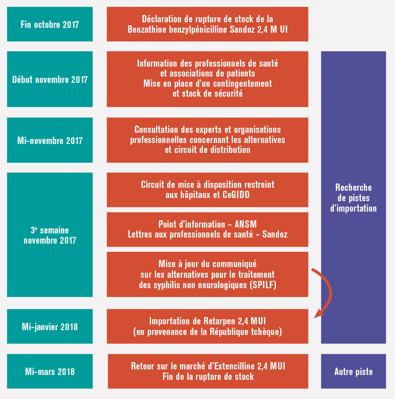 À la suite de problèmes de production survenus chez l’un de ses sous-traitants, le laboratoire Sandoz informait l’ANSM fin octobre 2017 d’une rupture de stock pour la spécialité Benzathine benzylpénicilline Sandoz 2,4 MUI à compter de décembre pour une durée d’au moins six mois. Devant cette situation critique, l’ANSM a déployé un plan d’action, qui se décline en trois axes : informer, prendre les mesures urgentes qui s’imposent, et identifier d’autres médicaments similaires disponibles à l’étranger. Comme en 2014, la Société de pathologie infectieuse de langue française (SPILF), le Groupe de pathologie infectieuse pédiatrique (GPIP) de la Société française de pédiatrie (SFP) et la Société française de dermatologie (SFD) ont été informées rapidement des nouvelles difficultés rencontrées ainsi que les associations de patients, comme le Groupe inter-associatif traitements et recherche thérapeutique (TRT-5). Afin de préserver les stocks disponibles et dans l’attente des nouveaux approvisionnements, les premières mesures ont été prises : suivi hebdomadaire des consommations ; mise en place d’un contingentement par le laboratoire Sandoz ; mise à disposition restreinte en milieu hospitalier et dans les centres gratuits d’information, de dépistage et de diagnostic des infections par le VIH, des hépatites virales et des IST (CeGIDD) et création d’un stock de sécurité pour les demandes de dépannage d’urgence. Des lettres d’information ont été envoyées par le laboratoire aux professionnels de santé, et l’ANSM a publié plusieurs points d’information sur son site internet.4 La SPILF a actualisé son communiqué relatif aux alternatives pour le traitement des syphilis non neurologiques5 en tenant compte des informations du Centre national de référence (CNR) de la syphilis sur le niveau élevé de résistance des souches de tréponème à l’azithromycine, antibiotique qui n’est donc plus recommandé comme alternative. En parallèle, l’ANSM a engagé des démarches auprès de Sandoz et d’autres laboratoires afin d’importer des spécialités similaires disponibles à l’étranger. Sandoz disposait d’un stock d’une spécialité identique (Retarpen 2,4 MUI) en République tchèque qui pouvait être mobilisé pour le marché français. En janvier 2018, l’ANSM autorisait l’importation de Retarpen 2,4 MUI permettant, en complément des mesures déjà prises, de repousser de deux mois et demi la rupture totale du dosage à 2,4 MUI qui interviendra le 12 février 2018. À partir de cette date, il ne restait plus en France que le dosage à 1,2 MUI, imposant deux injections pour obtenir l’équivalent d’une injection à 2,4 MUI pour le traitement de la syphilis de l’adulte. En raison de l’enjeu de santé publique engendré par cette situation critique d’épisodes récurrents de ruptures de stock, la remise sur le marché des spécialités Extencilline a fait partie des pistes envisagées par l’ANSM pour mettre à disposition de façon pérenne d’autres spécialités de benzathine benzylpénicilline en France