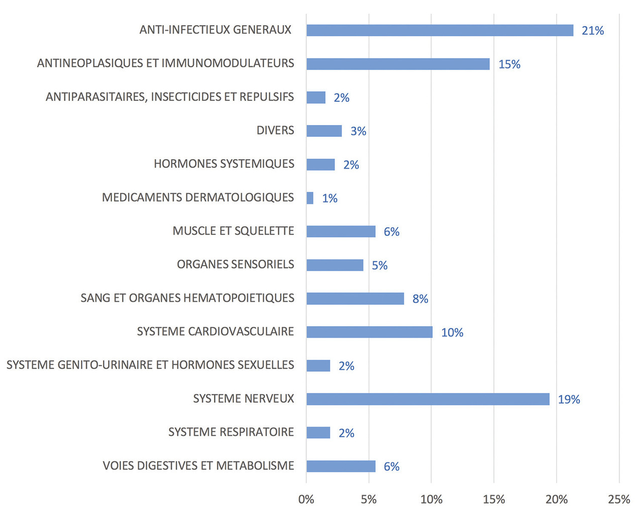 Les trois classes thérapeutiques les plus impactées par ces ruptures de stock en 2017 en France étaient les médicaments anti-infectieux (administrés par voie générale), les médicaments du système nerveux et les médicaments anticancéreux. Elles totalisaient à elles seules plus de la moitié de l’ensemble des ruptures de médicaments d’intérêt thérapeutique majeur déclarées à l’ANSM en 2017
