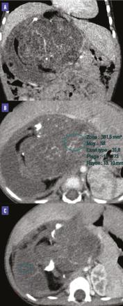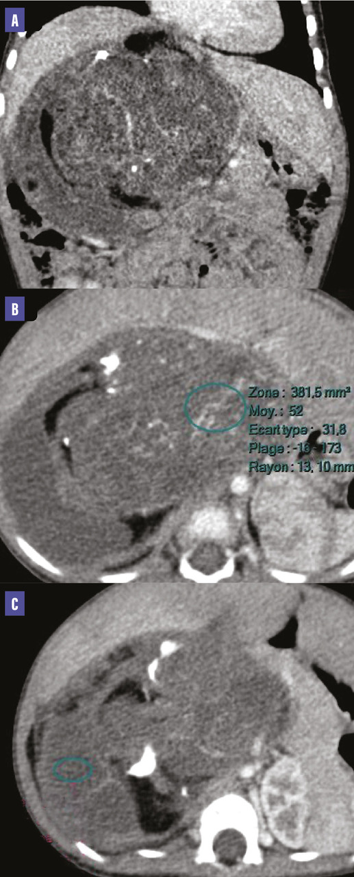 Au scanner, le tératome se présente comme une tumeur à triple composante kystique, graisseuse et tissulaire. Un niveau liquide-graisse au sein de la lésion évoque un tératome mature, mais il est aussi décrit dans des liposarcomes bien différenciés.