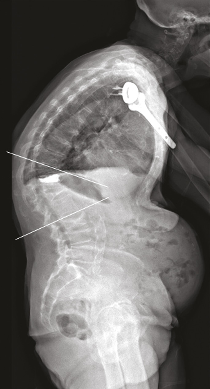 La présence de fractures incidentes augmente le risque de nouvelles fractures. Outre les douleurs, la multiplication des fractures vertébrales peut avoir des conséquences très délétères sur la statique rachidienne : perte de la lordose lombaire et augmentation de la cyphose thoracique. En particulier, les fractures de la charnière thoraco-lombaire, siège de prédilection des fractures ostéoporotiques, à la jonction d’un segment rachidien relativement fixe et d’un segment mobile, entraînent souvent une cyphose angulaire importante et préjudiciable sur le plan fonctionnel. Une seule fracture cunéiforme de la charnière thoraco-lombaire ou du rachis thoracique inférieur peut même générer 15 à 20° de cyphose, ce qui est loin d’être anodin.21 La cyphose vertébrale est un marqueur du vieillissement physiologique et un facteur de morbidité, du fait du déséquilibre sagittal du rachis, de la diminution des capacités fonctionnelles et respiratoire, de la majoration du risque de chute et donc de nouvelles fractures (