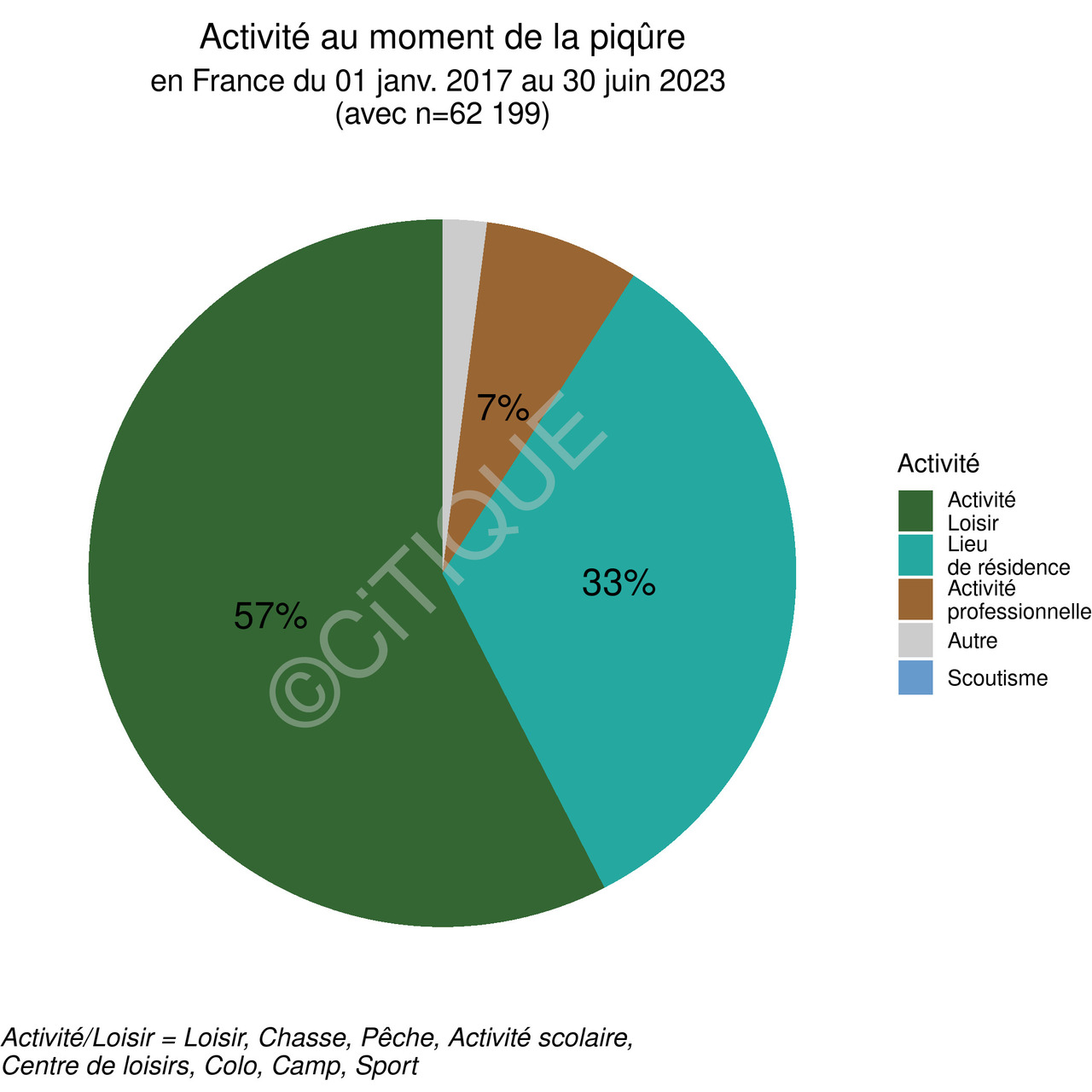 Par ailleurs, seulement 57 % des victimes de piqûre pratiquaient une activité de loisir : 33 % étaient dans leur lieu de résidence et 7 % exerçaient une activité professionnelle (fig. 3). Il est intéressant de noter que, bien que représentant un pourcentage des signalements assez faibles, de nombreuses piqûres sont déclarées lors d’activités scolaires.