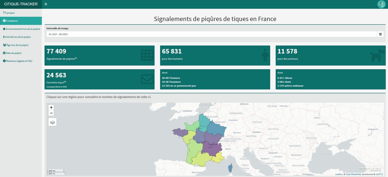 Dans l’objectif de mieux comprendre l’écologie des tiques et des agents pathogènes qu’elles peuvent transmettre (encadré ci-dessous), ainsi que d’améliorer la prévention, l’Inrae a lancé CiTIQUE-TRACKER : le site web https://ci-tique-tracker.sk8.inrae.fr/ permet de visualiser les données de signalement de piqûres de tiques issues du programme de recherche participative CiTIQUE, lancé en 2017.
