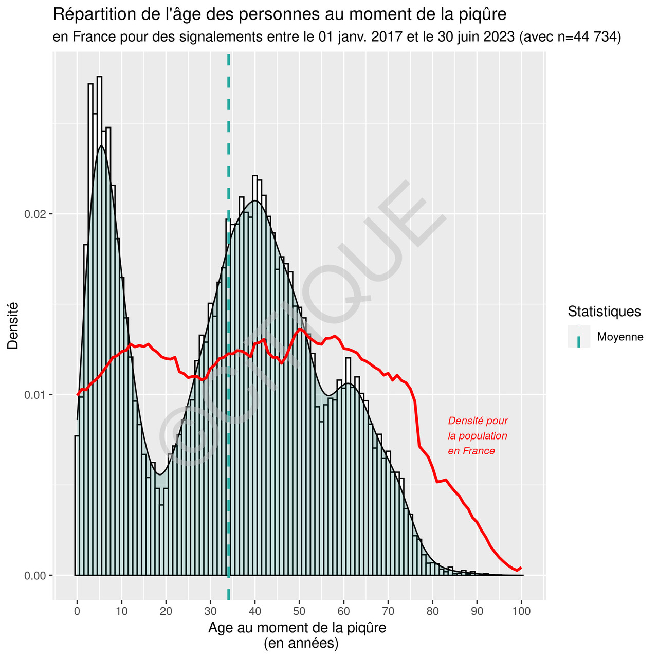 Un graphique montre l’âge qu’avaient les personnes au moment de leur piqûre, avec la possibilité de comparer ces données à l’âge de la population française (données Insee au 1er janvier 2023). Cette comparaison montre une sur-représentation des enfants de moins de 10 ans (fig. 4), qui incite à communiquer encore plus largement sur les gestes de prévention auprès des parents.
