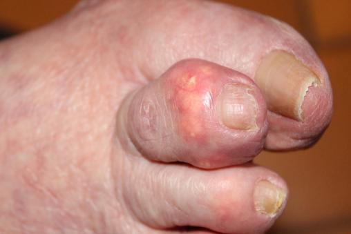 Émilie, 93 ans, souffre depuis quelques jours d’une douleur insomniante du 2e orteil du pied droit accompagnée d’une inflammation et de calcifications de la dernière phalange. (figure ). Sa fille est très inquiète car elle pense qu’il s’agit d’une artériopathie sévère nécessitant une amputation.