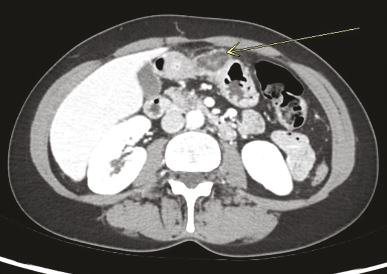 Biologiquement, la protéine C réactive (CRP) était à 31 mg/L, le bilan hépatique était normal. L’échographie a mis en évidence une vésicule alithiasique à parois fines sans dilatation des voies biliaires. La tomodensitométrie avec injection de produit de contraste, réalisée en urgence, a révélé un aspect typique de torsion de frange épiploïque (ou appendagite épiploïque) du côlon transverse, latéralisée à droite (