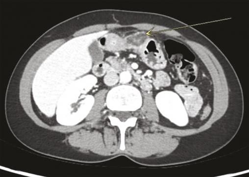 Cette patiente de 54 ans consultait pour une douleur abdominale aiguë, récente, épigastrique avec irradiations latéralisées à droite, sans fièvre, ni trouble du transit, ni nausée. L’examen clinique se résumait à une franche douleur de la zone concernée à la palpation, sans défense. L’abdomen était par ailleurs souple et indolore.