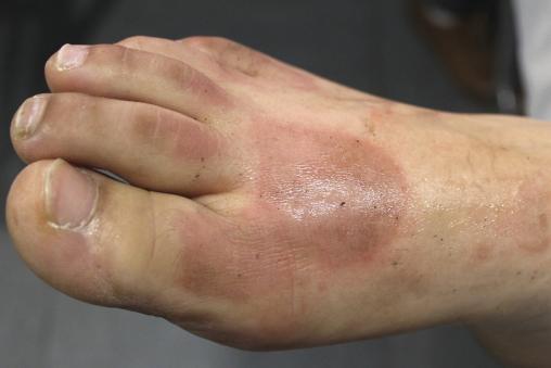Amina, 24 ans, jeune étudiante, travaille dans un laboratoire de recherche. Il y a 24 heures, lors de la manipulation d’acide acétique concentré, elle en a versé une certaine quantité sur un de ses pieds. Depuis, elle ressent une douleur vive, et a noté une hyperpigmentation de la zone concernée par la projection.