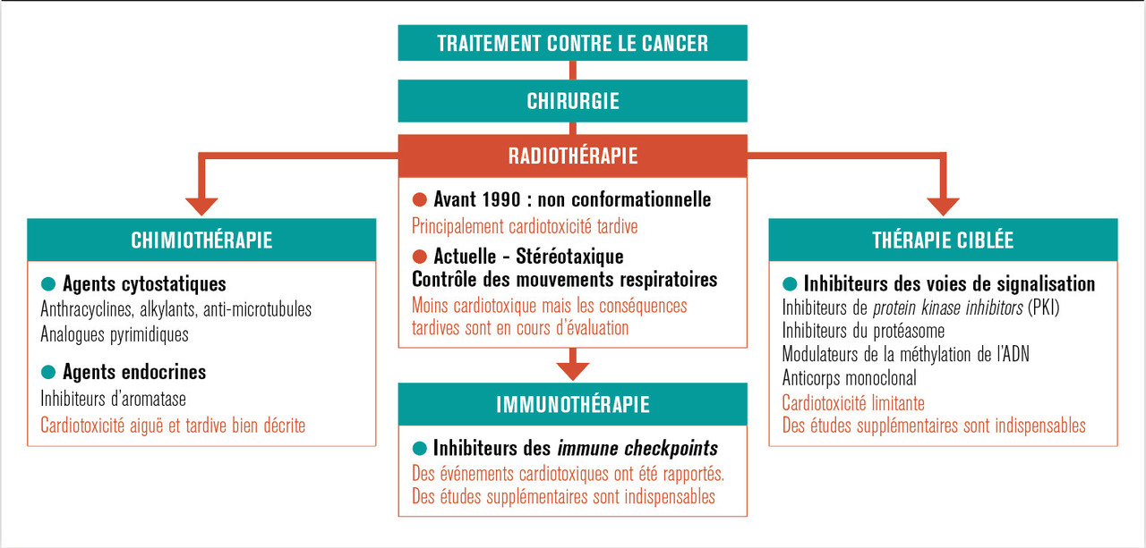 Simultanément, les protocoles standard de traitement du cancer ont évolué, et la radiothérapie est aujourd’hui combinée à diverses molécules (v. figure) de chimiothérapie et/ou de thérapies ciblées et/ou d’immunothérapie (petites molécules pharmacologiques et/ou biomolécules). Ces combinaisons thérapeutiques majorent l’efficacité antitumorale mais augmentent aussi les risques de complications cardiaques ; et si les complications cardiaques induites par la radio- et la chimiothérapie sont maintenant bien connues et caractérisées, les connaissances des complications cardiaques associées aux thérapies combinées restent très partielles. Ainsi, de nos jours, l’étude des phénomènes de toxicité cardiaque chez les patients cancéreux et les patients guéris du cancer demeure un problème clinique majeur qui nécessite la constitution d’équipes multidisciplinaires spécialistes de cardio-oncologie.1-3